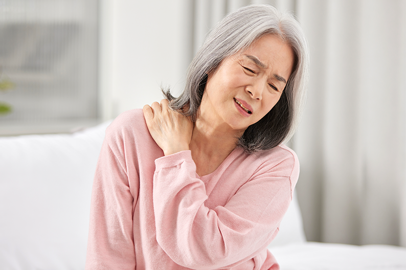 어깨와 엉덩이 주변 근육에 대칭적으로 통증과 뻣뻣함이 나타나는 것이 특징입니다.